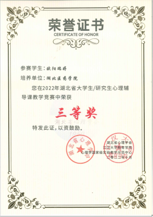 本网讯(通讯员 柴晓运)近日,人文社会科学学院应用心理学系收到湖北省大学生/研究生中小学心理健康课教学大赛组委会寄来的证书,我校选拔的2020级欧阳瑞婷、张宇琪和张柴青等三位同学均喜获三等奖。