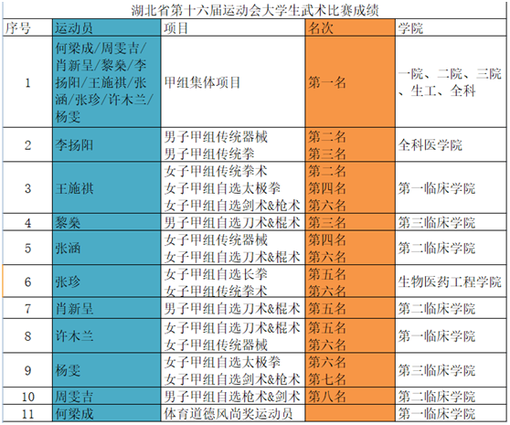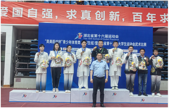 省运会四年一届,是湖北省最高级别的赛事,省各级领导部门高度重视,各高校派出精英组队参赛、竞争非常激烈。比赛中,我校武术队不畏强手,顽强拼搏,以精湛的技艺和优良的训练素养充分展现了民族传统武术的内涵和我校师生良好的精神风貌,征服了评委,得到了省教育厅、省体育局、大体协及各代表队专家的好评,获得了观众阵阵掌声,为学校争得了荣誉。