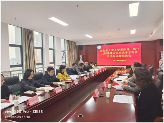 本网讯(通讯员 魏晨 陈全新)5月9日下午,我校举办了湖北省大中小学思政课一体化共同体建设示范校启动仪式暨推进会。校党委常委、统战部长谭艳、马克思主义学院班子成员、教学办、全体思政课教师、10个理事会成员单位负责人及骨干教师等共60多人参加了本次会议。会议由马克思主义学院刘冰院长主持。