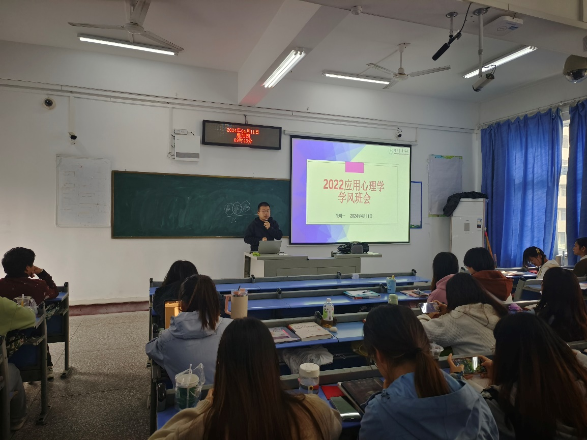 本网讯(通讯员 周佳佳)为落实学期初学院学风建设大会精神,构建班级优良学风,激发学生的学习兴趣与学习动机,2022应用心理学班兼职班主任朱明一于4月11日上午在5301教室召开班级学风主题班会。