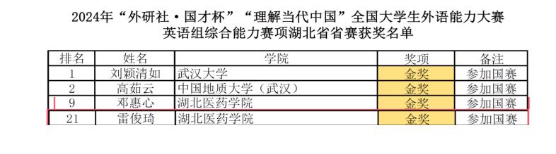 参赛学子在比赛中展现出了卓越的语言实践能力与综合素养,以及敏锐的思维洞察力,充分彰显了新时代大学生积极进取、勇于挑战的青春风貌。这一优异成绩的取得,不仅是对学生个人能力的肯定,也反映了湖北医药学院外语课部在外语教学改革和复合型国际化人才培养方面取得的显著成效,为学校的高质量发展提供了强有力的支撑。(审核 孔祥清)