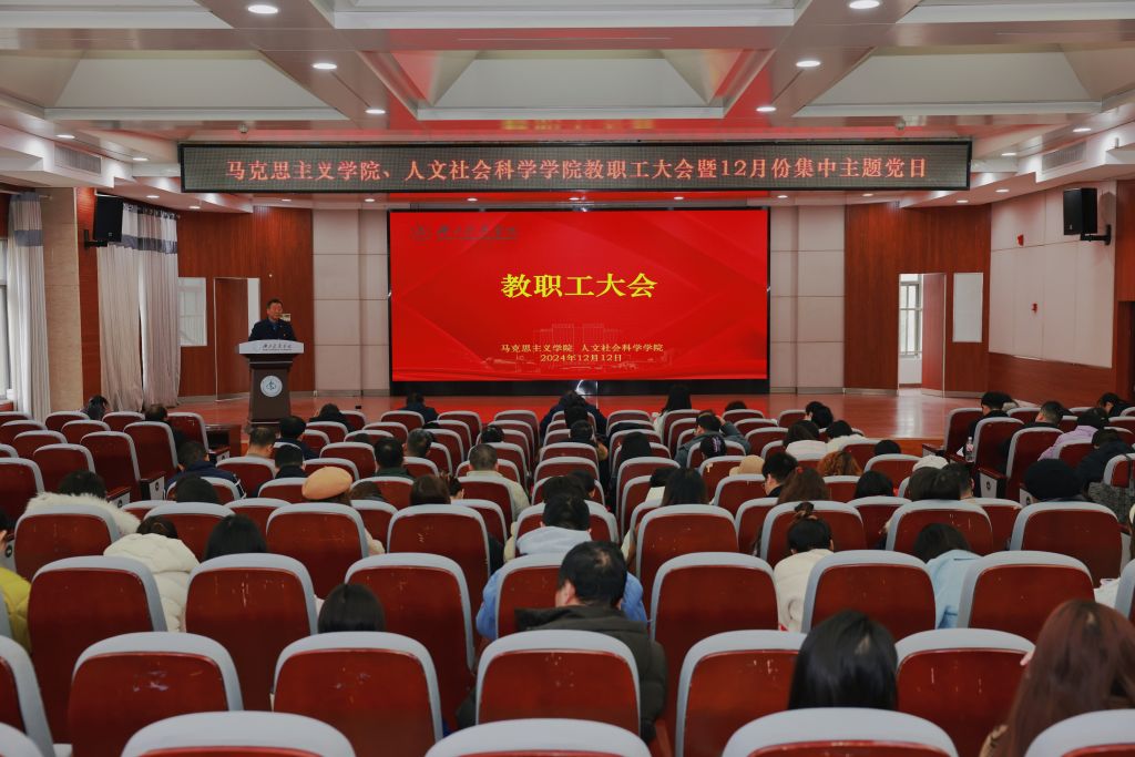 本网讯(图文 鲍晓宇)12月12日,马克思主义学院、人文社会科学学院在八号楼5楼思政课实践教学VR基地召开全体教职工大会。马克思主义学院、人文社会科学学院党委书记孔祥清主持会议。